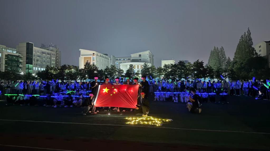 跑道上,哨声响起,同学们手持各色荧光棒,汇成一条璀璨流动的星河。点点荧光如音符般自由跃动,交织出一幅充满生命力的动态画卷。此刻,荧光闪耀,全体学生以青春之名,共同为母校50周年诞辰献上最炽热的祝福。