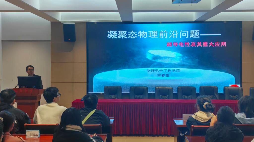 1114日,crown sport官方网站在理科楼402会议室聚焦凝聚态物理前沿问题——超导电性及其重大应用开展主题讲座。本次讲座特邀王春雷教授主讲,党委副书记张丽出席并主持会议,2025级物理学一班、二班全体学生参加。